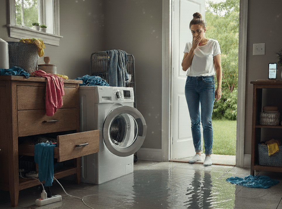 Schadensbeispiel: Während Sie im Urlaub sind, platzt ein Schlauch an der Waschmaschine. Die gesamte Wohnung steht unter Wasser, Parkett und Möbel sind ruiniert. Die Hausratversicherung zahlt den Ersatz
